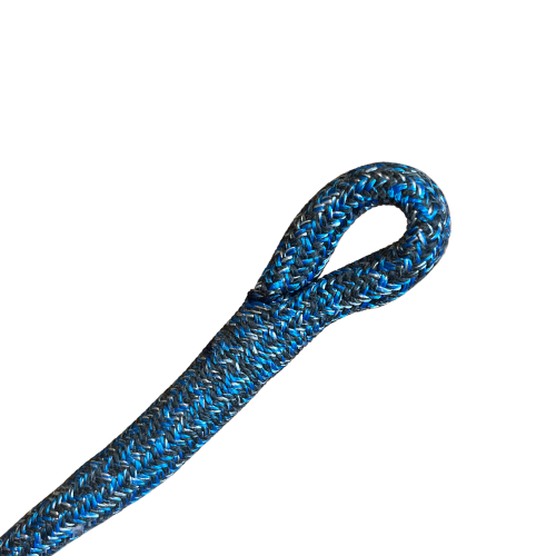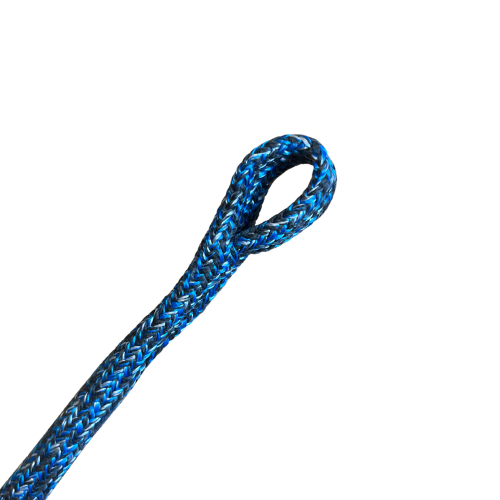 A heavy-duty eye splice that integrates core and cover into a generous loop of 10–15 cm inside length for winch lines, anchor rodes, and mooring lines. The fully buried cover adds maximum abrasion protection and UV resistance while the roomy eye accommodates oversized cleats, allows both girth hitch and cow hitch connections for reusable hardware, and handles repeated friction under load.