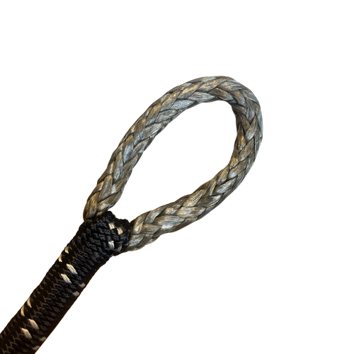 A core-only loop splice formed by stripping back the cover and burying only the high-tensile core into a large supple eye. This lightweight, flexible splice is perfect for cow hitching onto shackles, bars, or fairleads to reuse existing hardware without re-rigging. It retains nearly full core strength in performance running rigging but should be used where abrasion exposure is limited.