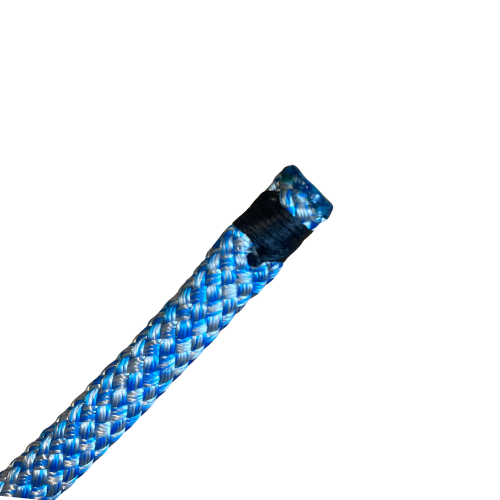 A compact eye splice that buries both the load bearing core and the protective cover of a double-braid marine rope into a neat loop. This low-profile abrasion-resistant splice maintains full breaking strength and UV protection while fitting into tight hardware or small carabiners used on sailboat halyards and control lines. It is ideal for sailing rigging applications that demand a durable clean finish and reliable load performance.