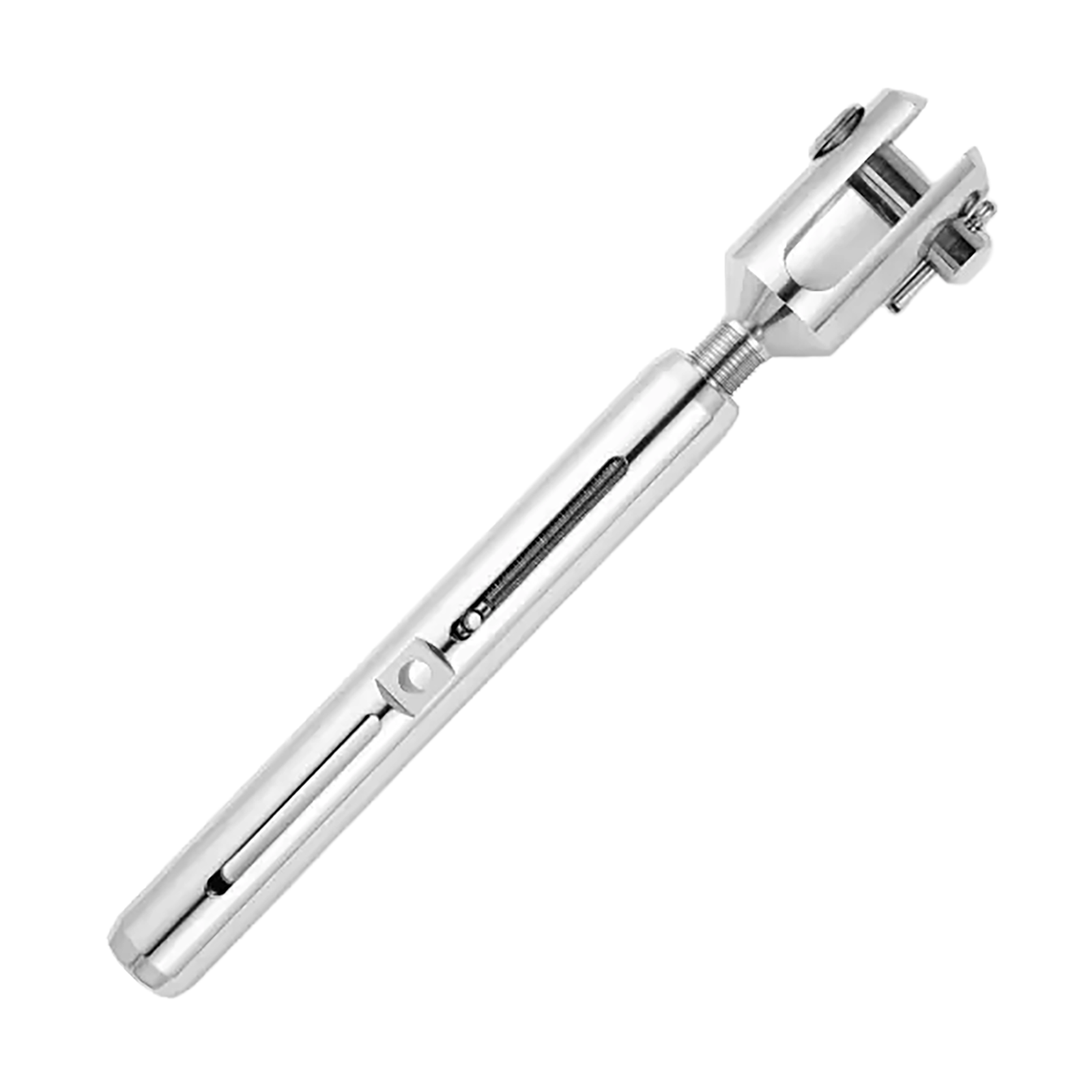 One end of the fitting features a precision-machined fork for a secure, fixed connection point, while the opposite end is left blank to allow flexibility in custom rigging configurations or to accept a future fitting of your choice. The open-body design gives clear visibility of the thread engagement during adjustment, simplifying inspection and maintenance. Once the proper tension is achieved, standard split pins may be used for positive locking, ensuring stability in all conditions.